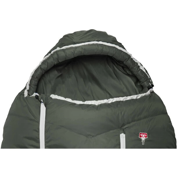 The wool also makes the sleeping bag more resistant to moisture than pure down. The pillow pocket is also very practical. Just insert a fleece jacket here and you already have a non-shifting pillow. The highlight is the zip which is round at the bottom and which means that if it should get too hot at any time, you can conveniently place your feet on top of the sleeping bag.